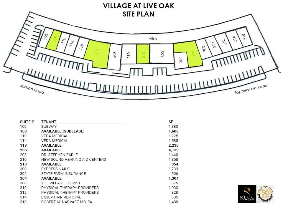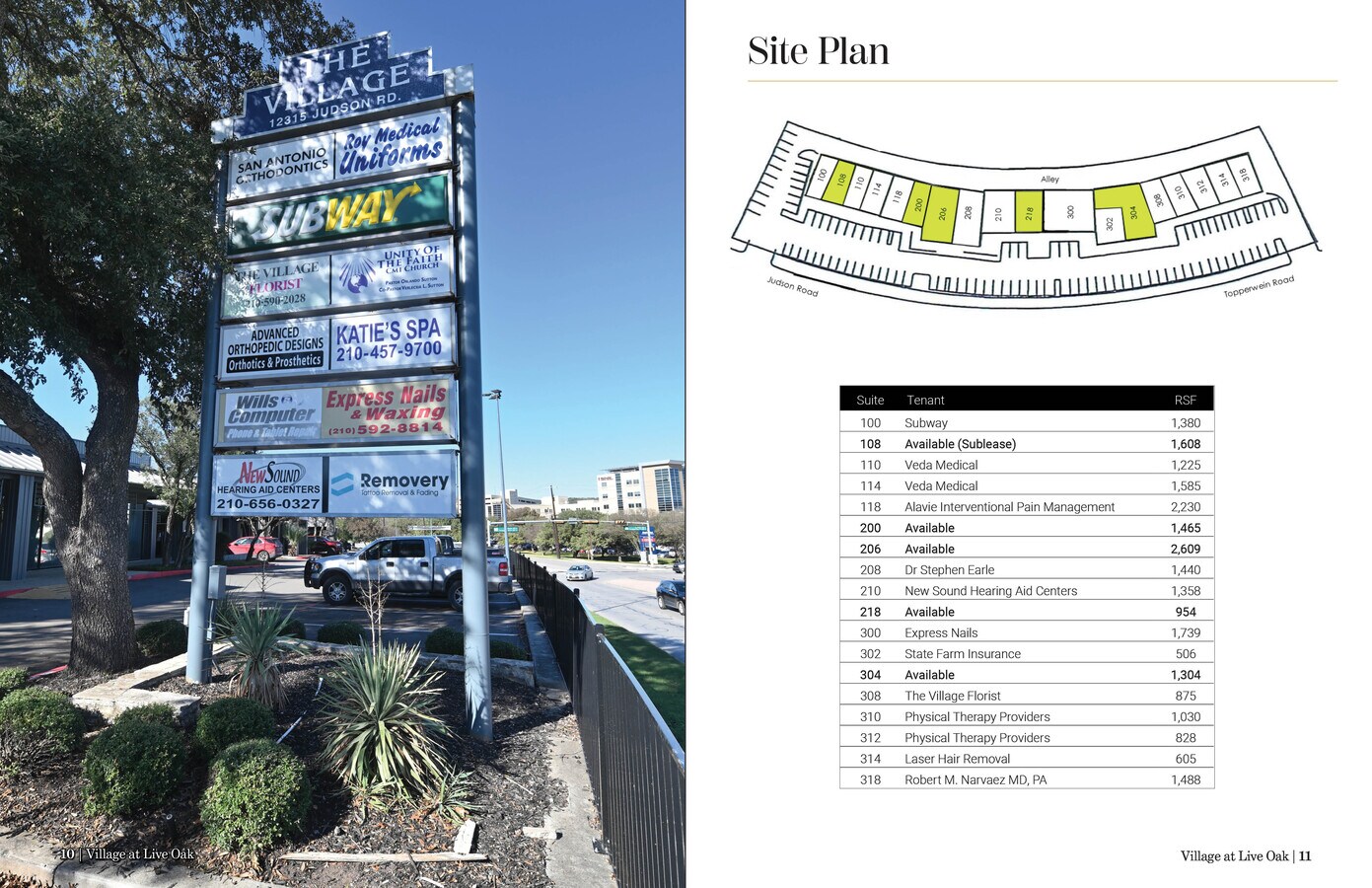 RENSEIGNEZ-VOUS SUR NOS OFFRES SPÉCIALES DE LOCATION. Situé à l'intersection très fréquentée de Judson Rd et Topperwein Rd, en face de l'hôpital méthodiste du nord-est, The Village at Live Oak propose une gamme variée de locataires comprenant des commerces, des bureaux et des établissements médicaux avec des tarifs de location compétitifs. Le centre offre une excellente visibilité et un accès facile au Northeast Methodist Hospital, à l'IH-35, au Loop 1604 et au Loop 410.