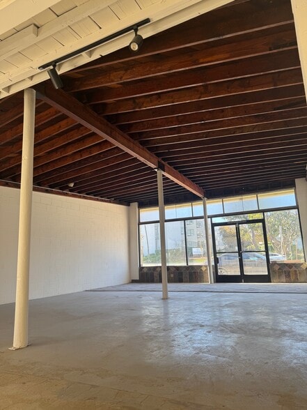Open-plan flex space with white brick walls, concrete floors, exposed wood beams, and natural light from front and rear access. Ideal for art studios, galleries, retail pop-ups, wellness classes, workshops, yoga, meditation, retail, content creation, or community events. Ideal for a tenant who wants to start a new concept and doesn't require complicated buildout or approvals. We can offer on such shorter terms introductory lease rates.
