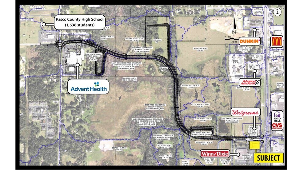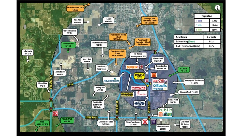 -0.96 acres with a 10,000 SF building available at signalized intersection -Shopping Center anchored by Winn Dixie -175’ of frontage along US Hwy 301/US Hwy 98 (28,000 AADT) -Morningside Rd is going to extend through to Fort King Rd and connect into Advent Health Hospital and Pasco County High School (1,636 student count) -Construction of Morningside Rd extension expected to begin in 2026 and open in 2027 -Brand new Ford Dealership and Chick Fil A going directly south of subject site -6,576 homes under construction and 1,823 homes in permitting within a 3-mile radius of site -Local retailers include: Winn Dixie, Walmart, Publix, CVS, Walgreens, Chick Fil A, McDonald’s, Burger King, Taco Bell, Dunkin, KFC, Checkers, ACE Hardware, Mavis, 7-11 & Circle K