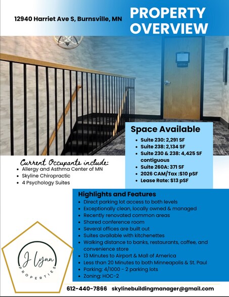 Espace de bureau professionnel/médical/financier Points forts et caractéristiques : • Exceptionnellement propre, détenu et géré localement • 13 minutes de l'aéroport et du Mall of America • À moins de 20 minutes de Minneapolis et de Saint-Paul • Commodités accessibles à pied • Espaces communs récemment rénovés • « Au cœur de la ville » • Salle de conférence partagée • Deux suites disponibles avec kitchenette • Stationnement : 4/1000 • Zonage : HOC-2 • À distance de marche des banques, des restaurants, des cafés et des épiceries Espace disponible : • Suite 105 : 2 331 pieds carrés • Suite 235 : 1 724 pieds carrés à 2 134 mètres carrés • Suite 260E : 248 pieds carrés • Taux de location : 12,00$ PSF NNN • CAM/taxe (2025) : 9,50$ PSF