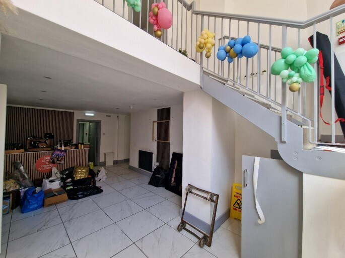 The available commercial accommodation comprises 224 sq ft at upper ground level and 691 sq ft at lower ground level, delivering a practical and flexible layout suited to a variety of Class E(a) users. The entrance provides striking volume with a double-height ceiling, enhancing visibility and customer impact. Internally, the space transitions into a mix of open operational areas and multiple treatment rooms, supported by modern essentials including air conditioning, a mechanical shutter, a kitchenette and WC. The configuration allows for efficient workflow while offering adaptability for retail, wellness, grooming, or other service-orientated occupiers