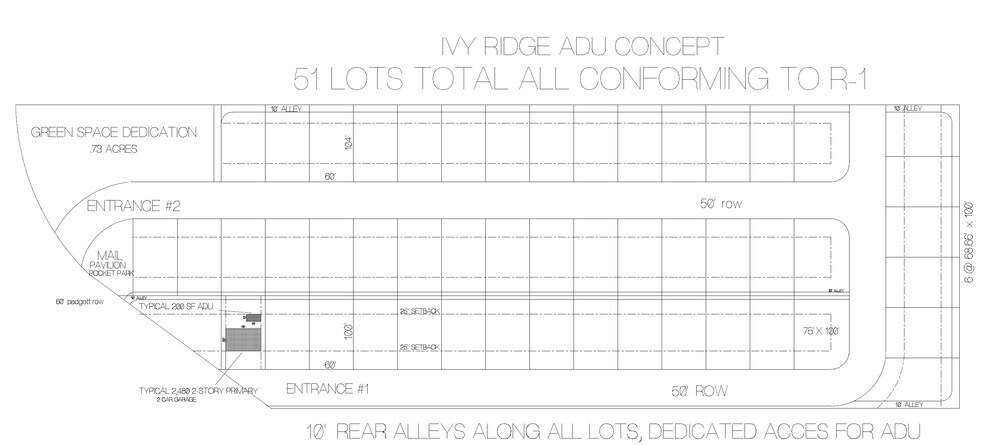 Conceptual subdivision layout could allow up to 50 lots with adequate space to accommodate ADU per lot.