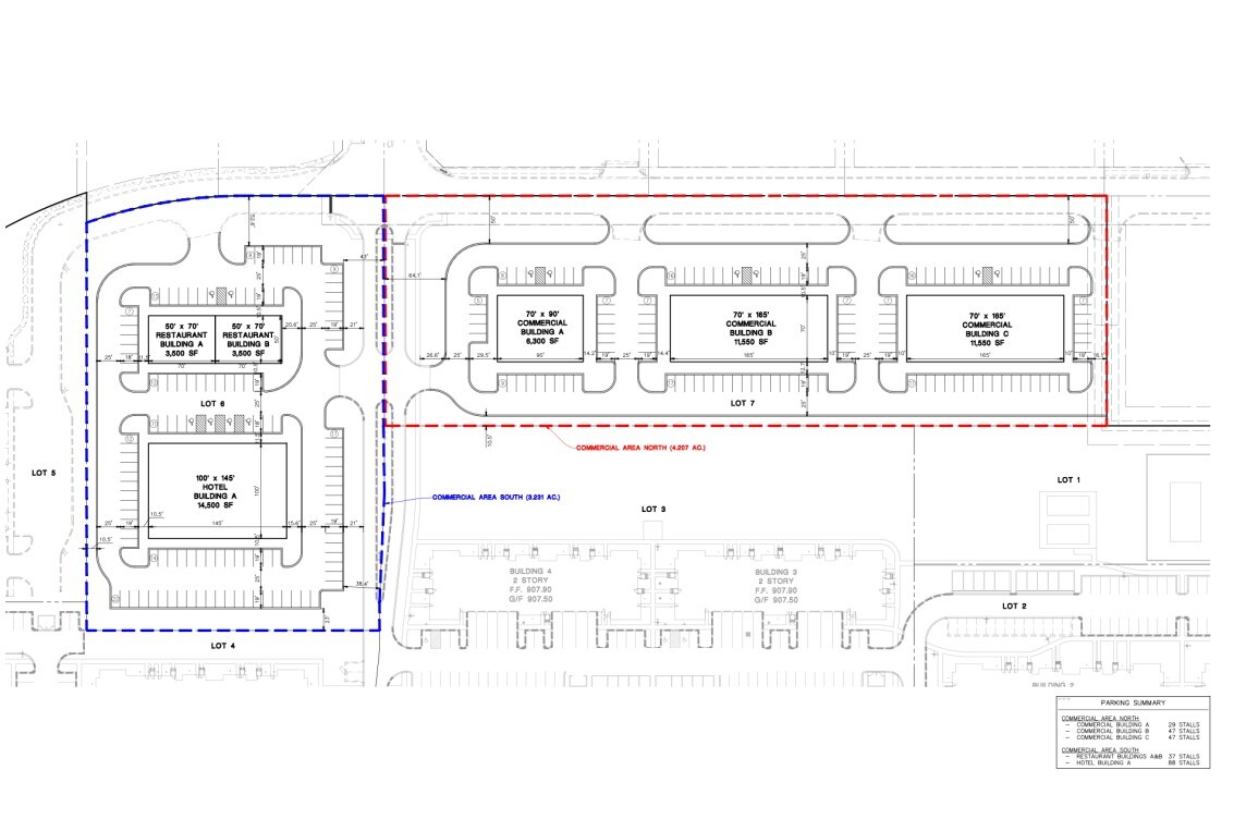Les lots 6 et 7 sont situés dans les lots extérieurs d'une nouvelle communauté de 300 appartements actuellement en construction. Situés juste au nord de l'hôtel Hampton Inn récemment construit, ces terrains polyvalents offrent une visibilité exceptionnelle et une position privilégiée pour le développement futur. Idéal pour diverses utilisations : restauration rapide, QSR, médecine, automobile, fitness, commerce de détail ou autres concepts axés sur les services.