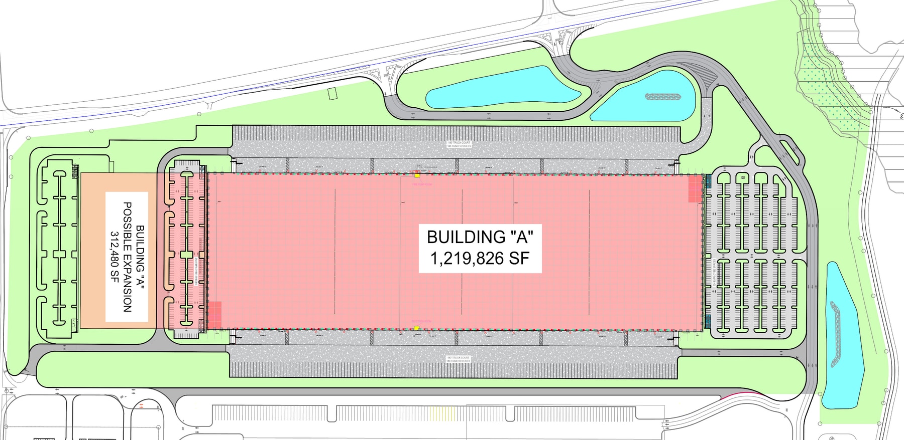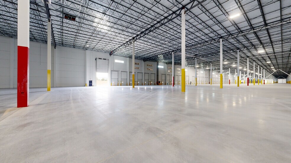 Lambert A at PNK Park Southern Gateway is a cross-dock industrial facility offering 1,219,826 square feet of space, expandable to 1,532,301 square feet. The building has a 40-foot clear height, 209 dock doors (101 with 40,000-pound mechanical pit levelers), and four drive-in doors (14 feet by 17 feet). It measures 620 feet in depth and 1,960 feet in width, with column spacing of 50 feet by 56 feet and a 60-foot speed bay. The truck court depth is 190 feet with a concrete apron. Parking includes 296 truck spaces (expandable to 360) and 784 auto spaces. The facility features an 8-inch reinforced slab (4000 psi), a 60-mil TPO roof with R-25 insulation, and an ESFR sprinkler system with K-25.2 heads. Electrical service includes 4,000 amps at 277/480 volts, three-phase. LED warehouse lighting with motion sensors provides 30 foot candles of illumination.