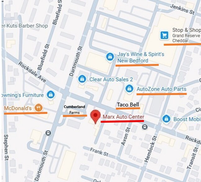 Exceptional opportunity for redevelopment or continued use as an auto sales and service enterprise. On a one plus acre parcel near a prime intersection on the Dartmouth/NB line with multiple entrances and exits on both Rockdale Ave. (NB). It has inherent characteristics that will create great value for the new owner: good traffic counts and surrounded by high profile vendors e.g. CVS, Cumberland Farms, Mc Donald's Taco Bell. AutoZone etc. Currently has 5 garage bays with lifts and an additional bay without a lift. Seller open to a joint venture. (0.23 ac in NB and 0.79ac in Dart.)