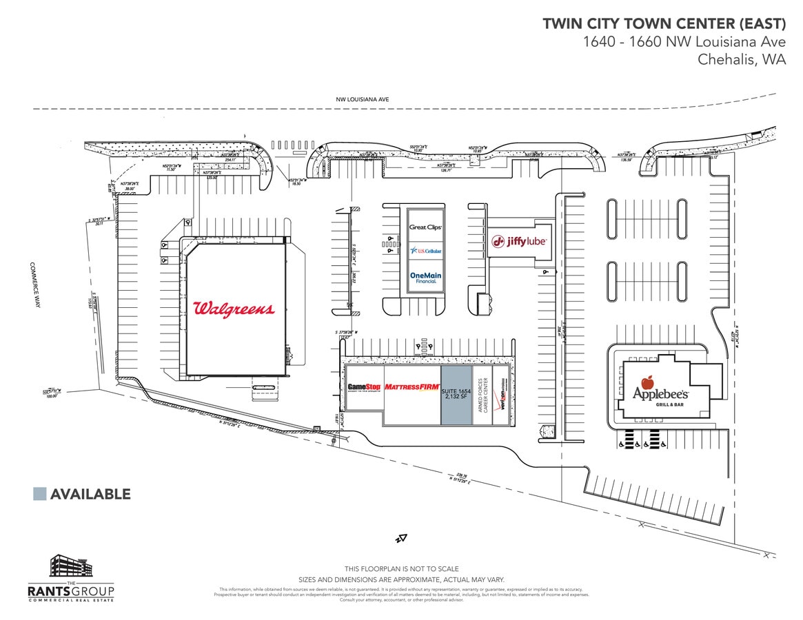 Retail opportunity in Twin City Town Center East, with direct freeway exposure and signage off I-5 exit 79, and 120,000 vehicles per day. The center has high-volume tenants, including Walgreens, Jiffy Lube, and Applebee’s. Landlord will install an ADA restroom and a small office/administrative space.