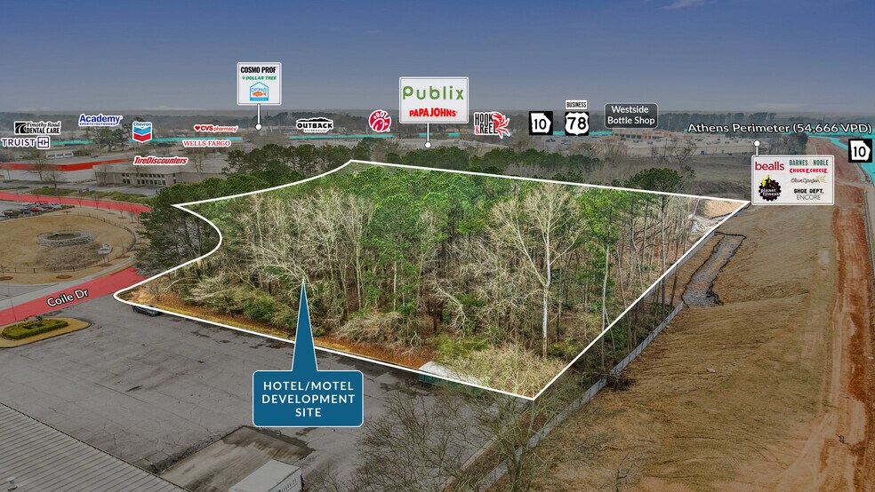 Sands Investment Group is pleased to exclusively offer for sale a 4.62-acre Hotel Development Site located at 125-135 Coile Drive in Athens, Georgia. The property is zoned C-G, allowing for a wide range of uses, including hotel/motel, restaurant, general retail, office, R&D, and others. The site benefits from a high-exposure location with ±650 feet of frontage along the Athens Perimeter (Loop 10), which carries approximately 54,666 VPD, providing exceptional visibility and accessibility.