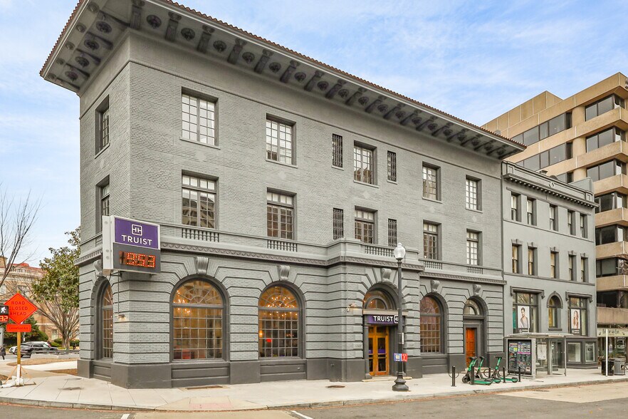 Le charme et le caractère distinctifs du Bank Building se reflètent dans ses quatre étages, offrant une vue magnifique sur DuPont Circle et les avenues Connecticut et Massachusetts. Le bâtiment magnifiquement restauré contient 21 000 pieds carrés d'espace commercial au total avec 13 000 pieds carrés de bureaux sur ses 3 étages supérieurs et 8 000 pieds carrés d'espace commercial de premier ordre sur Connecticut Avenue. Le bâtiment est ancré par Truist Bank et est situé juste en face de la station de métro et au centre de tous les grands magasins, restaurants et divertissements de DuPont Circle.