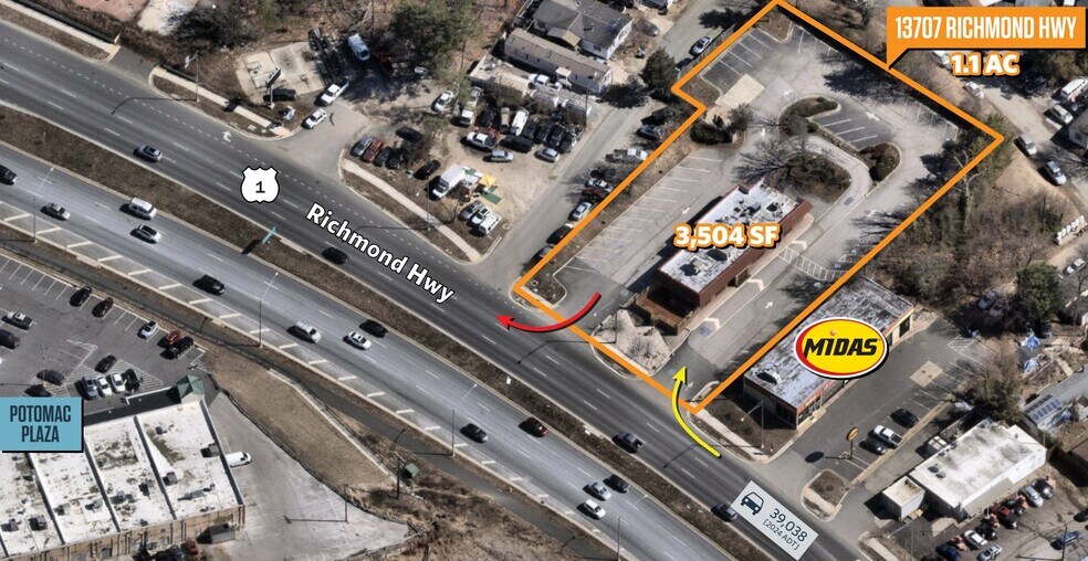 13707 Richmond Highway is located in Woodbridge, Virginia within Prince William County on the high-traffic Richmond Highway corridor. The property consists of a 1.1-acre parcel improved with a freestanding 3,504-square-foot building providing vehicular ingress and egress from Richmond Highway. Traffic volume on Richmond Highway is approximately 39,038 vehicles daily with additional access to I-95 nearby. Zoning is B1 which accommodates multiple retail, financial, and institutional uses. The immediate area contains established retail centers and big-box tenants including ALDI, CVS, Walgreens, and Ross. Regional access roads and proximity to other commercial destinations like Potomac Mills Mall contribute to strong connectivity.