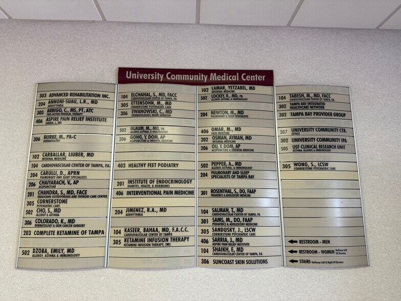Medical condominium for lease. 2,990 square feet Combined Units 401 and 402 in the University Community Medical Center Prime location - Located in the medical community area of AdventHealth Hospital, Moffitt Cancer Center, James A. Haley Veterans Administration Hospital, Pepin Heart Institute, and USF. Property has on site building management and maintenance, and cleaning staff for common areas, common area restrooms on every floor, plenty of parking in big lot around building. Move in ready condition. The condominium includes a waiting room, 4 doctor’s offices, 6 exam rooms (4 wet, 2 dry), front office, business office, storage rooms, conference room, kitchen, 2 private employee restrooms, and separate entrances for staff and patients. The Fire Safety Evacuation drawing in the photos is a rough sketch; some of the space has been slightly reconfigured since the sketch was drawn. We look forward to walking you through the property. Lease is triple net. Lessee is subject to approval by University Community Medical Center Board of Directors.