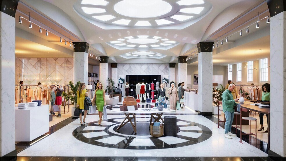 Ground floor and basement floors ideally suited for retail and leisure uses, with character features, including three glass dome skylights at ground floor