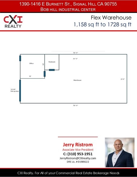 1,728 sf warehouse Private office (100 sf.) Private restroom 18 ft interior clear height* Skylight Tall 14’ roll up drive-in door Spacious parking lot with ample parking that can take deliveries of large trailers Located near Long Beach Airport and the Long Beach shipping port. Centrally and conveniently located near the 405, 605 and 710 freeways 24 hour access to tenants Property is well maintained Located in the Business Friendly and the Secure Community of Signal Hill