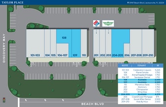 Taylor Place est un centre commercial de quartier de 34 895 pieds carrés situé dans un centre commercial animé à l'intersection des boulevards Beach et Hodges. Situé sur Beach Boulevard, un important corridor est-ouest menant aux plages, Taylor Place offre une excellente visibilité et dessert la population croissante du sous-marché de West Beaches. Le centre bénéficie d'un accès à un carrefour signalisé et est bien occupé par une gamme de locataires diversifiée, notamment Domino's Pizza, Wing Stop, un studio de danse, des services de garde d'enfants, un dentiste, des soins pour animaux de compagnie, un cabinet de chiropratique, etc.