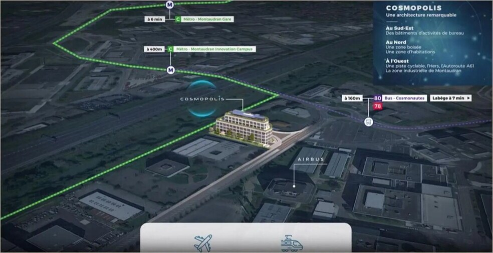 SECTEUR ZAC DU PALAYS Immeuble neuf / à construire de grand standing idéalement situé au coeur de la Zac du Palays à proximité immédiate d'Airbus Defense and Space. COSMOPOLIS bénéficie d'un emplacement stratégique au coeur de la zone Aerospace de Toulouse, à proximité directe de la future station de métro "Montaudran Innovation Campus". Immeuble de grand standing en R+2 Plateaux de 1 000 m² environ, divisibles Livraison en plateaux nus, prêts à cloisonner (hors cloisons, système de climatisation réversible, courant fort) Bâtiment en code du travail compatible ERP 5ème catégorie - Effectif 400 personnes pour la totalité de l'immeuble Parking : 45 emplacements de stationnement en sous-sol Surface RDC : 1035,17 m² Situation/Transports : Aéroport Aéroport de Toulouse (France) Bus Toulouse - Cosmonautes (Ligne 303) Autoroute A 61 (Entrée), A 61 (Sortie Périphérique Intérieur A 620), A 620 (Entrée Périphérique Intérieur), A 620 (Sortie Périphérique Intérieur) Bus Cosmonautes (80 L07) Rocade Ramonville (Périphérique Toulouse) Borne de recharge Airbus ADS - Toulouse - CSE - powered by DRIVECO (Bornes de recharge) Prix Parking sous-sol : 8400 Euros HD / U Conditions particulières à la vente : Prix Parking sous-sol : 8400 Euros HD / U Conditions particulières à la location : Loyer Parking sous-sol : 1150.0 Euros HT HC / U / an