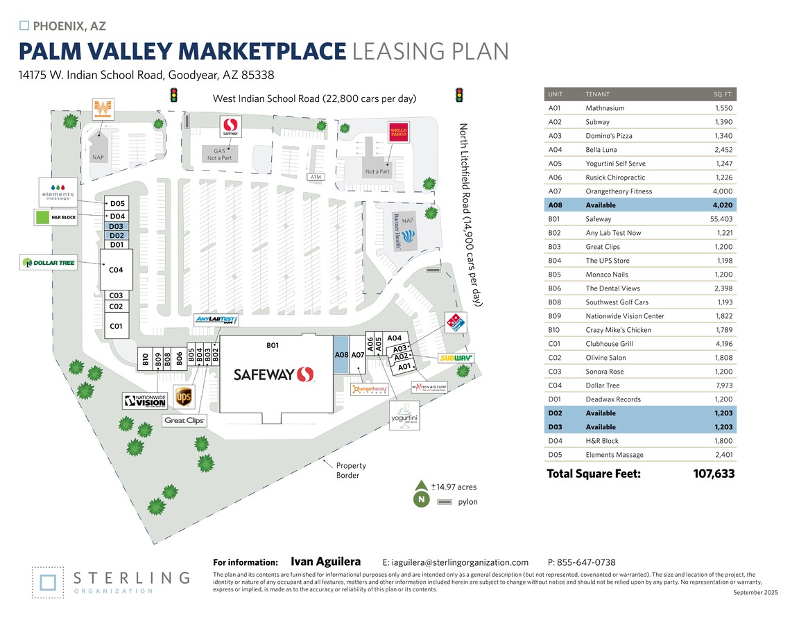 Centre ancré à l'épicerie de 107 633 pieds carrés. Ancré par une épicerie Safeway très performante. Parmi les autres locataires figurent AAA, GNC, H&R Block, Great Clips, Domino's Pizza, OrangeTheory Fitness et Subway. Situé à l'angle sud-ouest de West Indian School Road et de Noth Litchfield Road, les principales artères commerciales de la région. Au sein de la communauté planifiée de Palm Valley. Juste à côté de l'Interstate 10, dans le sous-marché de Goodyear à Phoenix.