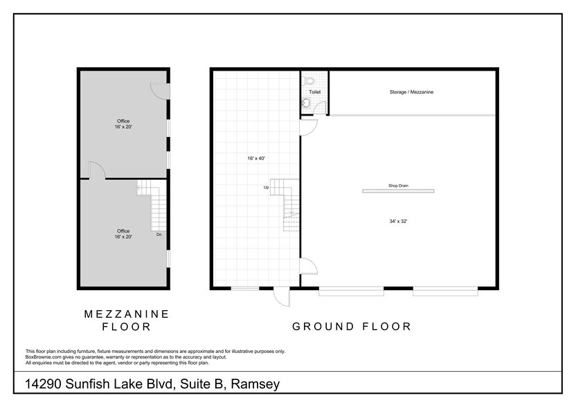 2,640 SF Office / Warehouse for Lease * 2 - 14' tall drive in doors * Main level office / showroom (wide open) * Mezzanine office area * Floor Drain * 2,000 SF footprint with 640 sf mezzanine office plus mezzanine storage area in shop * Epoxy floors in shop and office $2,640 per month gross rent (Tenant pays electric, gas and garbage) Address: 14290 Sunfish Lake Blvd, Suite B, Ramsey, MN 55303 The space currently has a dealers license No auto service / repair