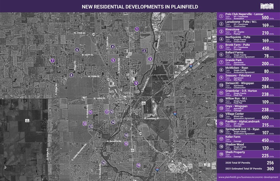 Plusieurs lots à vendre, à louer ou à construire sur mesure. Projet Diageo/Seefried : 1. Bâtiment Diageo de près de 1,5 million de pieds carrés sous le toit à l'ouest 2. Le projet Diageo/Seefried attirera 450 à 500 employés dans un premier temps Plus de 2 230 unités résidentielles en cours de construction dans la région : 1. Seize 30 appartements (284 unités) en construction 2. Développement Greenbrier le long de Steiner, au sud de la 143e rue - 238 maisons unifamiliales 3. Willow Tree Farm (K Hovnanian Homes) - Homes approuvées par la SEC Drauden et Lockport pour les maisons unifamiliales 4. Demande de développement locatif de maisons de ville reçue pour SEC 143rd & Steiner Prolongation est de la 143e ligne reliant l'I-55 - la construction commence en 2024 et s'achèvera en 2025 Le prolongement ouest de la 143e rue jusqu'à Ridge Road sera achevé en 2024