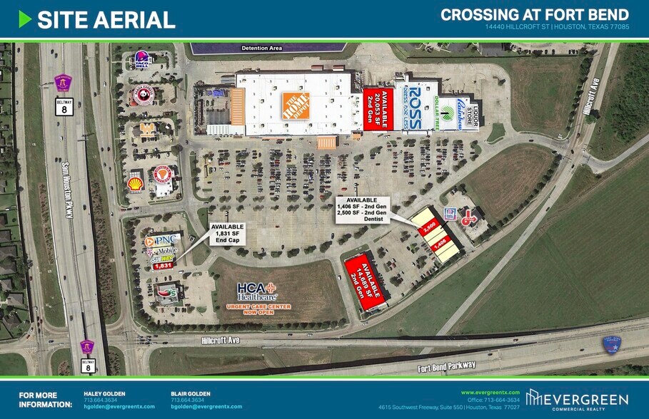 Centre commercial ancré par Home Depot situé à l'intersection du périphérique 8 et du péage de Fort Bend. Des dizaines de détaillants nationaux, de restauration rapide et de restaurants se trouvent dans le centre, notamment Ross Stores, Dollar Tree, HCA Healthcare, PNC Bank, Rainbow, Subway, T Mobile, Baskin Robbins, Jiffy Lube, Chilis, Popeyes, Chevron, Whataburger, Panda Express, NTB. Nombre de trafic élevé. Zone à haute densité et projets de développement résidentiel, industriel et de bureaux robustes à proximité - Options de pavage face à la route à péage de Fort Bend - Situé sur la route à péage de Fort Bend et le périphérique 8 entre Sugar Land et Pearland - Embout Prime disponible