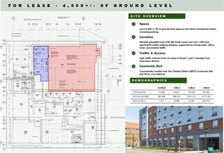 À louer : jusqu'à 4 500 pieds carrés PRÉSENTATION DU SITE : Rez-de-chaussée des suites Hilton Homewood avec parking 465 chambres d'hôtel à quelques minutes de marche Densément peuplé Trafic intense sur une bretelle d'accès à la route 1 7 minutes du centre-ville de Boston Excellent mélange de commerces de détail, de bureaux, d'hôtels et de trafic étudiant Plus de 1 000 nouveaux appartements accessibles à pied À proximité de la gare de train de banlieue de Chelsea et de la station Silver Line « T »