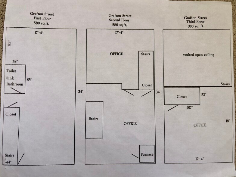 You have 2 options... Rent first floor only, 580 sq. ft. OR all 3 floors, 1466 sq. ft. (interior measurements). All our tenants have outgrown the space due to their success! 10,000+ cars daily, exposure is free and constant. 2 minutes to MA Pike (I-90), Rte. 20, Rte. 135. 8 minutes to Rte. 140, Rte. 146, Rte. 135, Rte. 9 and I-290. 15 minutes to I-190. Located directly on Rte. 122 (Grafton St.). Directly on the Worcester/Millbury line. Great signage, dedicated parking. Currently used as office space. First floor office/retail has generous storefront windows with lots of light, close to street, 12' high ceilings, recessed lighting, mini split affords inexpensive heat and a/c. Separate bathroom. Large closet for storage. Why fight for exposure in a strip mall when you can be only one of 2 available units? First floor features no-step entry so it's perfect for any professional: CPA, lawyer, sales staff or small retailer. There are additional floors available... Second floor offers hardwoods, lofted space, lots of light. Third floor is carpeted with an additional closet. Your choice:Rent 1st floor, or all 3 floors. $2000 or $4000 triple net. Minimum flexible one year lease, options for longer leases available.