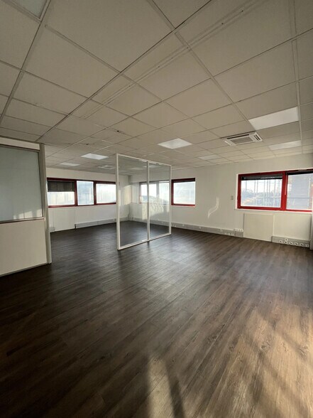 dans un immeuble rénové un ensemble de bureau de 110 m² situés au premier étage. les locaux sont en bons état avec un sol pvc neuf et cloisons amovibles. le cloisonnement se décompose en : - une salle de réunion - un grand open space divisé avec une cloison vitrée - un grand bureau - 1 pièces archive avec baie de brassage il existe un point d'eau dans les bureaux climatisation réversible fibre dans les locaux directement souplesse des baux ( commercial, professionnel et dérogatoire) immeuble situé dans un ensemble de 3 batiments identiques très grand parking sécurisé avec barrière qui se lève et se ferme automatiquement entre 8 h et 19 h et accès par code avant ou après et jours fériés A voir rapidement ! bon etat proche aeroport et rocade climatisation neuf fibre grand parking securise