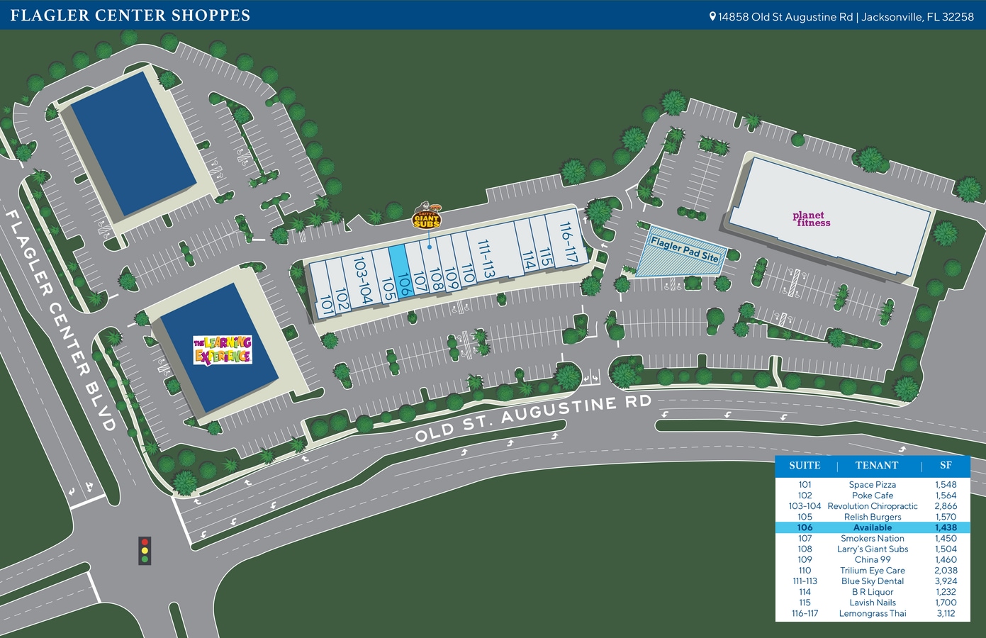 The Shoppes at Flagler est un centre commercial de quartier de plus de 50 000 pieds carrés construit en 2015. Situé entre Kenan Dr. et Flagler Center Blvd. près de Philips Hwy. (US1), en face du Flagler Center de 1 022 acres, qui abrite le Baptist Medical Center South. Situé à proximité des autoroutes I-95, I-295, Philips Hwy (US1) et du marché immobilier qui connaît la croissance la plus rapide de la région.