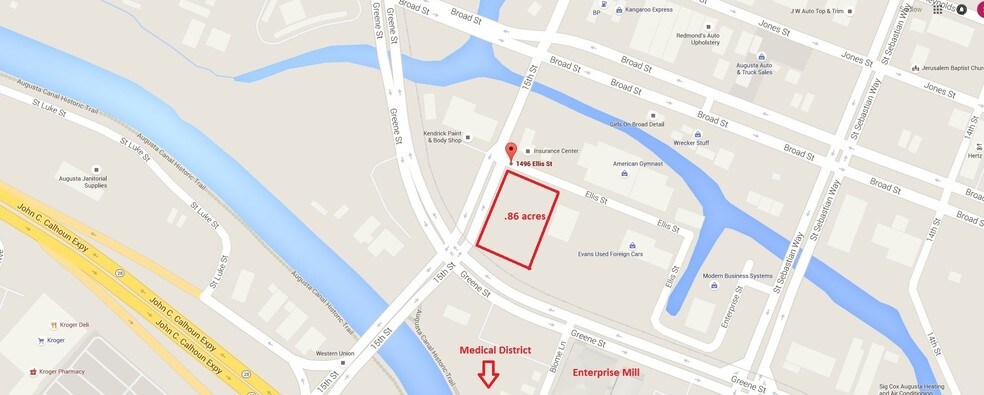 Le 1496 Ellis Street est un terrain d'angle de 8,6 acres avec façade sur Greene Street, Ellis Street et 15th Street. Cette propriété est zonée LI. Le site est prêt avec tous les utilitaires disponibles. Ce site est idéalement situé entre le quartier central des affaires et le complexe médical d'Augusta, qui abrite l'université d'Augusta, l'hôpital universitaire, l'hôpital VA et l'hôpital pour enfants de Géorgie. Le 1496 Ellis Street est facilement accessible via l'autoroute Calhoun, Riverwatch Parkway et Fifteenth Street.