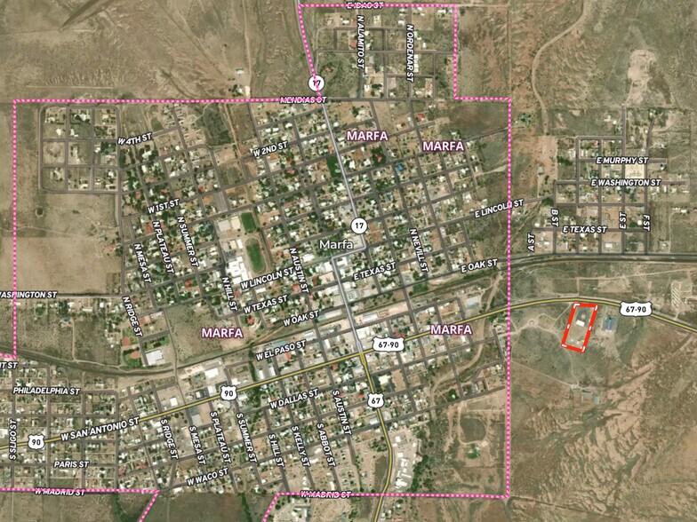 Propriété unique sur 4,7 acres à l'extérieur de Marfa, au Texas ! Environ 295 pieds de façade sur l'autoroute Est 90 donnant un accès direct à la propriété et une excellente visibilité. Plusieurs bâtiments de la propriété, dont un bâtiment principal d'environ 5 000 pieds carrés, deux bâtiments en briques d'adobe, dont l'un dispose d'une salle de bain complète pour un bureau ou une résidence, et un grand atelier de métallurgie pour le stockage ou les véhicules. L'eau provient d'un puits privé mais l'eau de la ville et un compteur alimentent également la propriété. Le bâtiment principal est doté de sols en béton teinté, d'une grande salle de spectacle avec une scène et des cabines de son, de deux salles de bains commerciales et d'une cuisine spacieuse avec des comptoirs en carrelage Saltillo. Une chapelle unique en adobe située à l'arrière de la propriété complète cet emplacement incroyable, juste à l'extérieur des limites de la ville de Marfa. À voir pour apprécier !