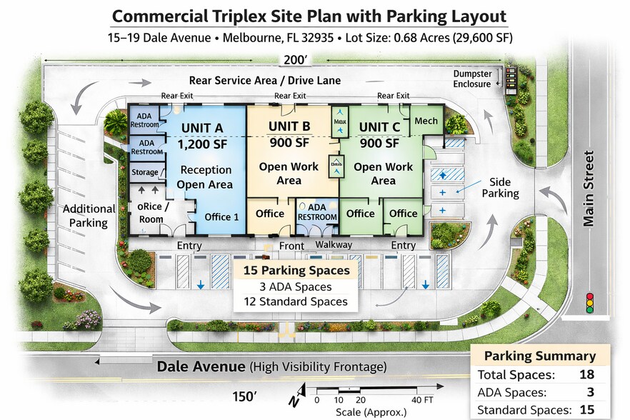 Profitez de cet emplacement d'angle très visible au cœur du quartier commercial en pleine croissance de Melbourne. Cette propriété défrichée de 0,68 acre, composée de deux lots adjacents situés aux 15 et 19 avenue Dale, offre une façade et une accessibilité exceptionnelles dans une zone bénéficiant des récentes améliorations routières et de l'expansion commerciale continue.