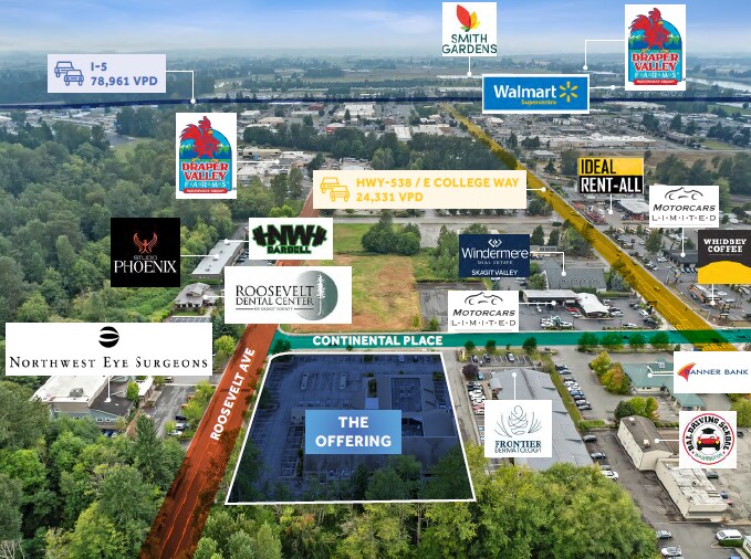 BROWN RETAIL GROUP is excited to present the exclusive opportunity to acquire 1500 Continental Place, a 19,904 SF medical office building located in the heart of Mount Vernon, Washington. The property was built in 2001 with durable masonry construction, and has two operating rooms. The site spans 1.66 acres with 82 surface parking stalls, delivering an above-market 4.12/1,000 SF parking ratio—an operational advantage for patient-oriented practices. Demographic trends in the surrounding area provide strong support for continued medical demand. The 5-mile population is projected to grow to over 62,600 by 2029, with nearly one in five residents aged 60 or older. Positioned just 1.6 miles (5 minutes) from Skagit Valley Hospital, the property is strategically located within the region’s core healthcare corridor, enhancing both referral opportunities and long-term tenant viability.