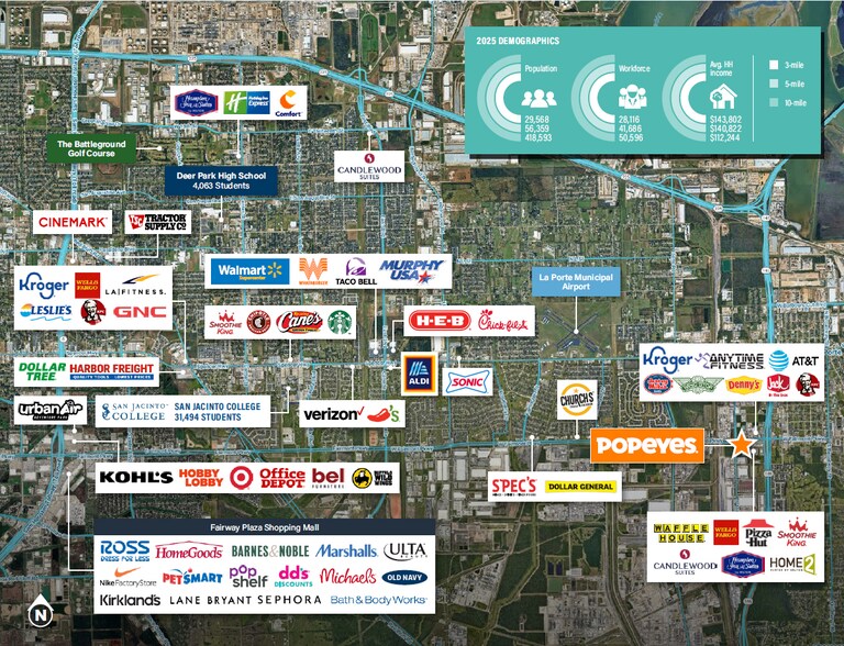 The property is situated along Fairmont Parkway, one of the primary east-west retail corridors in La Porte and Pasadena, with excellent visibility and traffic exposure. The surrounding area includes national retailers such as Kroger, Wingstop, Jersey Mike’s, Anytime Fitness, and Hampton Inn & Suites, and benefits from proximity to the Port of Houston and major employment centers. The location also serves a dense daytime population supported by schools, industrial parks, and residential communities.
