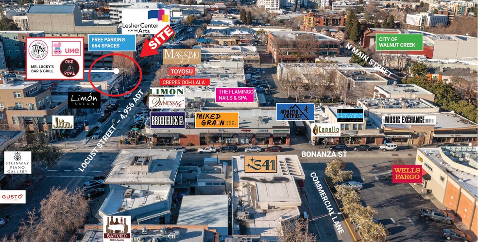 Charming retail space located in the heart of Walnut Creek’s most vibrant and eclectic neighborhood. The site benefits from ample daytime pedestrian traffic driven by downtown employment density and growing population, along with Walnut Creek’s long established reputation as the premier shopping destination in the East Bay. 1525 Locust: 2,227 SF Endcap 1531 Locust: 3,251 SF •Located steps from 660+ stall public parking garage and the renowned Lesher Center for the Arts. •Pedestrian friendly, downtown location. •Located in a vibrant and ecclectic neighborhood. •Located on the most desirable dining and entertainment block in Downtown Walnut Creek.