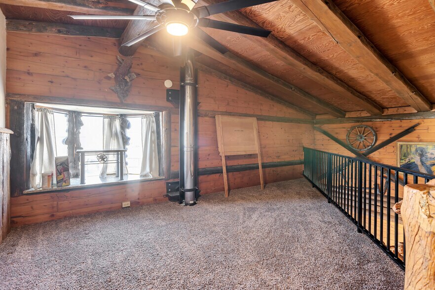 The ±2,100 SF two-story log structure can function as a residence, office headquarters, or mixed-use live/work space. Interior features include granite countertops, stainless appliances, gas range, spacious laundry, loft area, mini-split HVAC systems, and a wood-burning fireplace. Major improvements were completed approximately two years ago, and the property maintains energy-efficient performance with average electric costs of approximately $200/month for both the main building and shop.