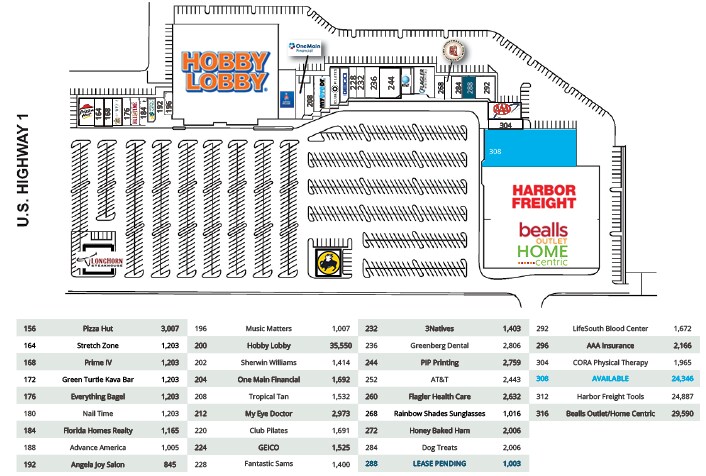- 24 346 pieds carrés disponibles - Stratégiquement situé à l'angle nord-est de l'US-1 et de la SR 312, dans le corridor commercial le plus recherché de Saint-Augustine - Centre commercial de 196 655 pieds carrés au design unique - Facilité d'accès aux intersections éclairées de l'US-1 et de la SR 312 - En face de l'hôpital Flagler, qui compte 335 lits et plus de 1 800 employés - En tant que destination touristique majeure, Saint-Augustine accueille environ 6 millions de visiteurs par an