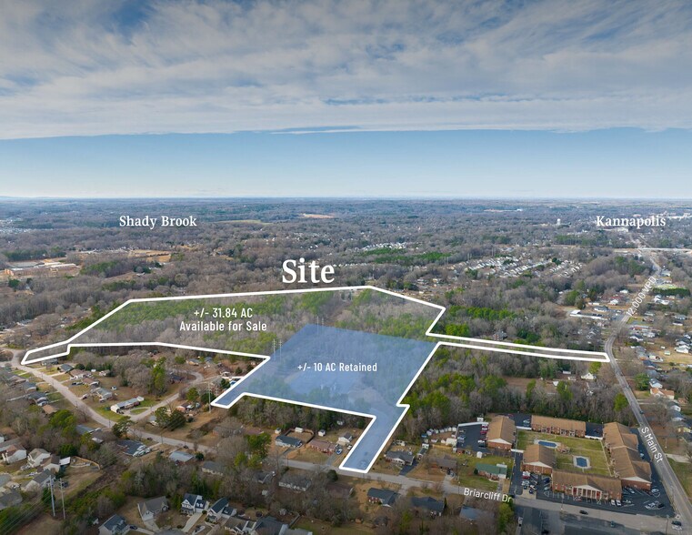 156 Briarcliff Drive in Kannapolis, NC offers a rare opportunity to acquire a +/-31.84 acre entitled residential development tract within the City of Kannapolis, with zoning in place to support immediate single-family execution. The site is zoned R-4, allowing up to 4 dwelling units per acre by right, translating to an estimated +/- 120 single family lots under current zoning standards. +/- 10 Acres will be retained by the current ownership, resulting in the marketed acreage total of +/- 31.84 acres. Located just off S. Main Street (12,000 VPD), the property sits within an established residential corridor surrounded by existing neighborhoods and ongoing residential growth. The site benefits from proximity to downtown Kannapolis, retail, schools, and employment nodes, supporting strong for-sale housing demand in Cabarrus County. The property is currently vacant land and is subject to typical development considerations, including topography, environmental features, and utility capacity. While Kannapolis is not under a sewer moratorium, new residential development is governed by the City’s Wastewater Allocation Policy, requiring allocation approval prior to development. Allocation timing represents a key underwriting variable, with municipal system expansions planned in the coming years. For builders seeking additional upside, the site also presents longer-term optionality through potential rezoning, with preliminary analysis indicating capacity for increased density subject to City approvals and infrastructure availability. Overall, 156 Briarcliff Drive represents a well-located, entitled single-family development opportunity with scale, market depth, and future flexibility.