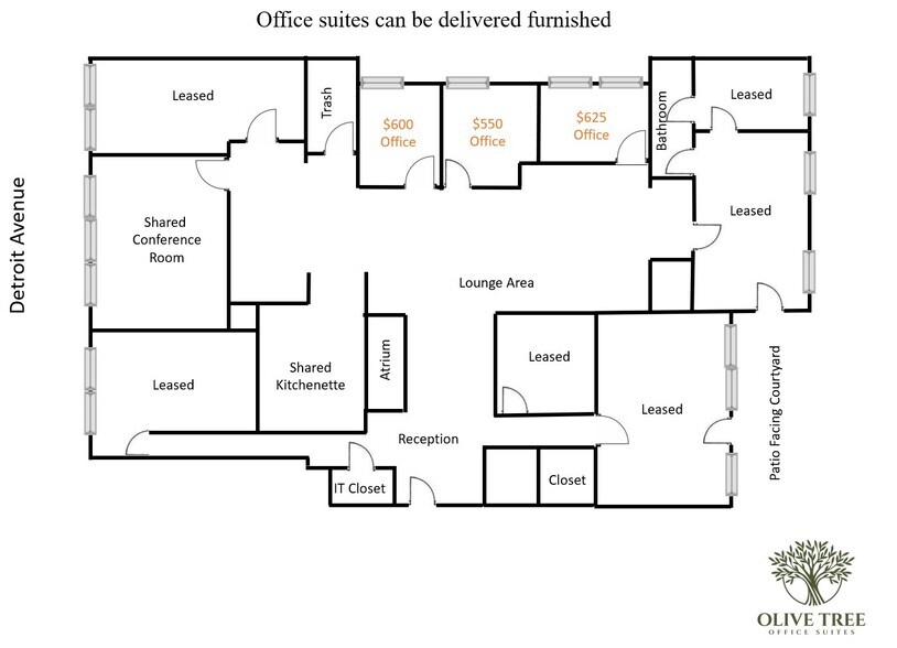 Olive Tree Office Suites est une communauté de huit bureaux privés partageant des espaces communs bien aménagés, une kitchenette et une salle de conférence. Les bureaux varient de 90 à 190 pieds carrés. 550$ à 695$ par suite selon la taille. Le loyer comprend le chauffage, la climatisation, le WIFI haut débit et l'accès 24h/24 et 7j/7. Des durées de location flexibles allant de 12 à 36 mois. Soyez l'un des premiers à occuper cet espace récemment rénové.