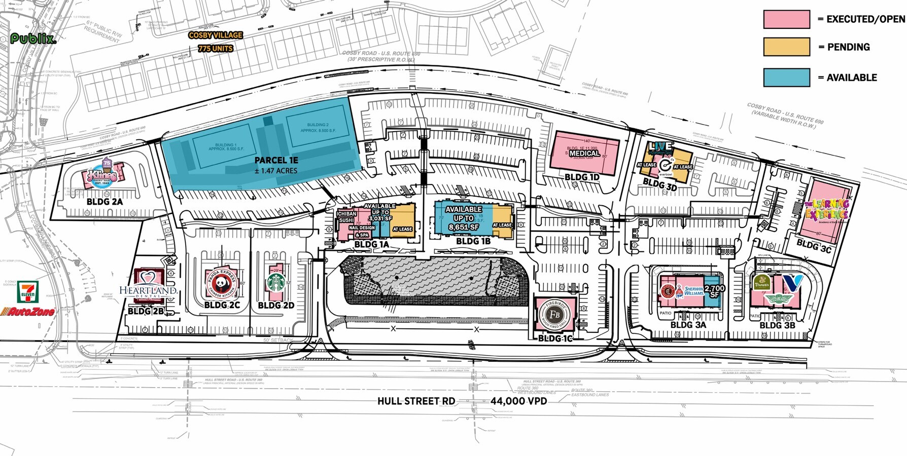 The project features a thoughtfully designed layout with retail spaces ranging from 1,322 SF to 12,363 SF and build-to-suit office or medical sites up to ±1.47 acres.