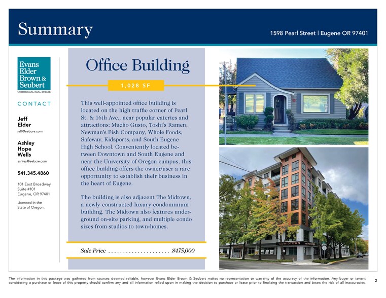 This well-appointed office building is located on the high traffic corner of Pearl Street & 16th Avenue, near popular eateries and attractions: Mucho Gusto, Toshi’s Ramen, Newman’s Fish Company, Whole Foods, Safeway, Kidsports, and South Eugene High School. Conveniently located between Downtown and South Eugene and near the University of Oregon campus, this office building offers the owner/user a rare opportunity to establish their business in the heart of Eugene.