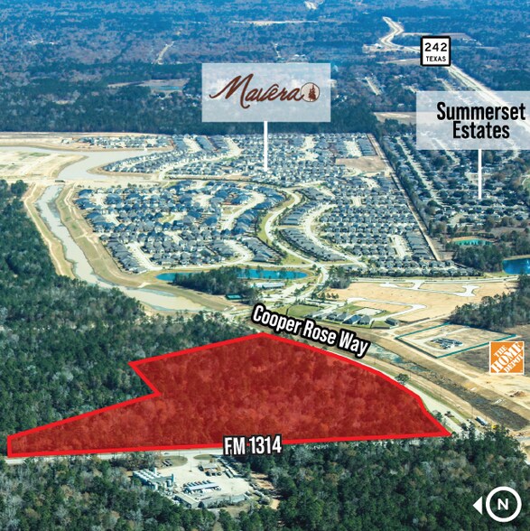 The ±26.87 acre tract located at Cooper Rose Way and FM 1314, positioned between Mavera and Evergreen communities, is just north of the signalized intersection at