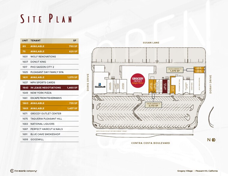 Gregory Village Shopping Center, located at 1601 Contra Costa Blvd, Pleasant Hill, CA 94523, is a well-established, grocery-anchored retail center situated on a high-traffic arterial corridor with excellent visibility and accessibility. Built in 1950, the center spans approximately 43,902 square feet on a 3.62-acre lot and features multi-tenant occupancy with a mix of local and national retailers. The property offers a variety of retail spaces ranging from 625 to 6,173 square feet, including high-identity end-cap units and monument signage opportunities. With 28,928 average daily traffic (ADT) on Contra Costa Blvd and 269,900 ADT on nearby Highway 680, the center benefits from strong vehicular exposure. The surrounding area boasts dense residential neighborhoods, a daytime population exceeding 78,000 within 3 miles, and affluent demographics with average household incomes over $135,000. Gregory Village is strategically positioned near other major retail hubs like Downtown Pleasant Hill and Sunvalley Shopping Center, making it a prime location for businesses seeking visibility and foot traffic in the East Bay market.