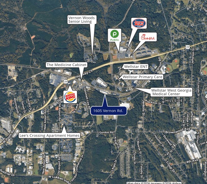 Le centre médical de Vernon Road à LaGrange est composé de trois bâtiments distincts situés sur Vernon Road, en face du campus des services de santé et du centre médical de Géorgie occidentale. Le site bénéficie d'une excellente visibilité et de multiples points d'entrée/sortie.