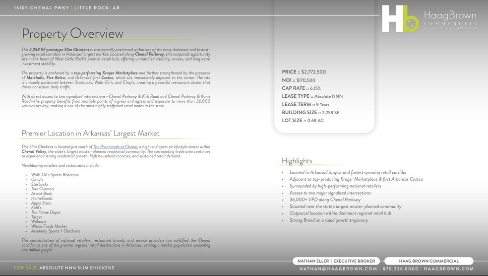 This 2,258 SF prototype Slim Chickens is strategically positioned within one of the most dominant and fastest-growing retail corridors in Arkansas' largest market. Located along Chenal Parkway, this outparcel opportunity sits in the heart of West Little Rock's premier retail hub, offering unmatched visibility, access, and long-term investment stability.