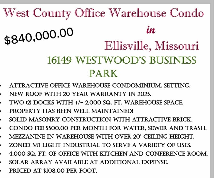 Explore the 16149 Westwood's Business Park. This Listing features a new roof in 2025 with a twenty (20) year warranty. The building has been well maintained and features +/- 4,000 Sq. Ft. of Office and +/- 2,000 Sq. Ft. of warehouse. This building has two docks and ample parking in the back of the unit.