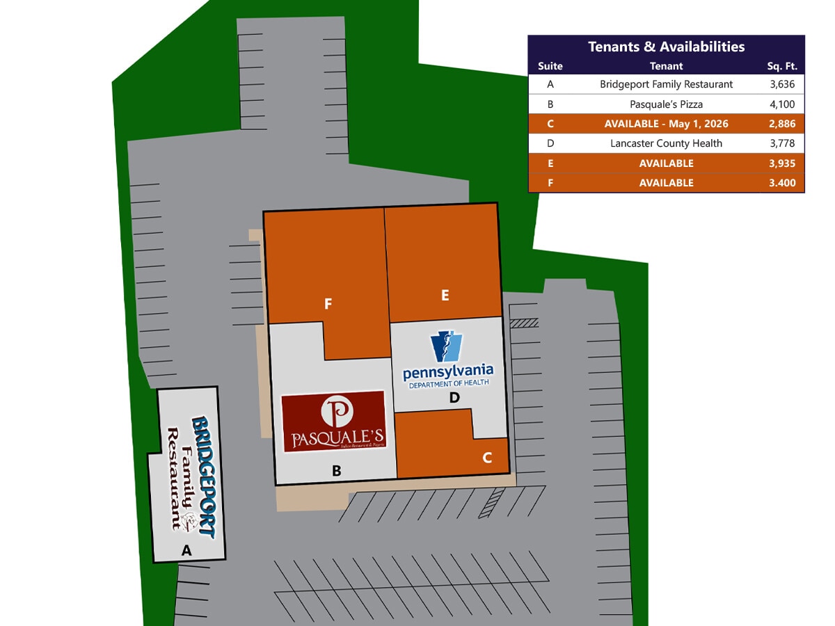 • 3,935 SF • Shared exterior entrance with secure reception/waiting area • Large open area suitable for a bullpen or 12–14 cubicles • Six (6) private offices and a Conference Room • Kitchen/breakroom • Large storage room, file room, and data/IT room • Private shower/restroom, plus two (2) additional single restrooms • Shared entrance from side parking lot and private access from rear lot. Suite E is perfect for physical therapy, chiropractic offices, early education facilities, daycare centers, and general or professional office use. This space is move-in ready and located in a high-traffic area filled with amenities, making it ideal for a variety of users who value convenience, visibility, and a well-established commercial environment.