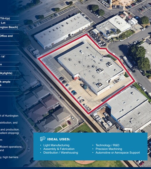 • 25,330 SF Freestanding industrial building on 1.35 acre parcel in the heart of Huntington Beach’s industrial corridor. • Highly functional layout – ideal for manufacturing, assembly, distribution, and high-power users. • Ample power supply (800 amps/480 volt) for heavy equipment and production. • Multiple oversized loading doors and dock position support excellent shipping/ receiving flow. • High image front office/showroom area with potential for modern tenant improvements. • Warehouse skylights and sprinklers provide bright, safe, and efficient operations. • Convenient access to the (405) & (22) freeways, Beach Blvd, and Warner Ave corridors. • Strong West Orange County industrial market – limited vacancy, high barriers to entry.