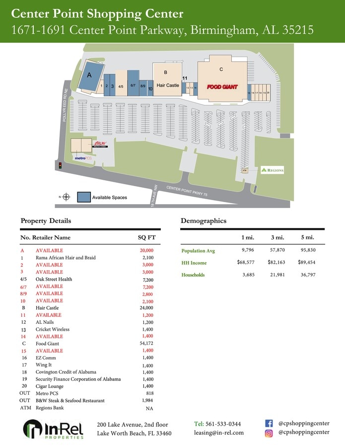 Located just 20 minutes outside of downtown Birmingham, the Center Point Shopping Center is right off Center Point Parkway and Florida State Road 75, which offers excellent brand exposure in a prime location in an established retail corridor.
