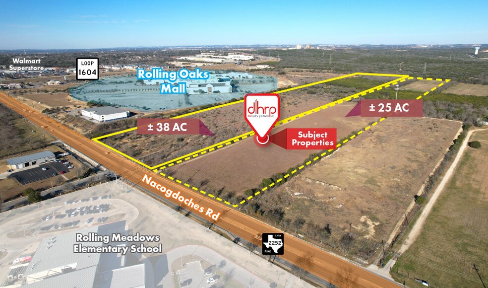 ±63 AC of commercially zoned land located in Northeast San Antonio directly beside Rolling Oaks Mall and with property frontage on Nacogdoches. This area is rapidly developing, currently with large multi-family, retail, and industrial construction projects underway. Located with convenient access to Loop 1604 and I-35. All utilities are readily available at or near the site. HIGHLIGHTS • ±63 AC | Parcels can be purchased separately: (±25 AC / ±38 AC) • ±900 FT of Frontage on High-Traffic Nacogdoches Rd • Easy access to Loop 1604 and I-35 • Located in a rapidly developing area • Close proximity to Walmart, Rolling Oaks Mall, The Forum, Bracken, Garden Ridge, Selma, Schertz, Universal City, and Live Oak • All utilities at or near sites