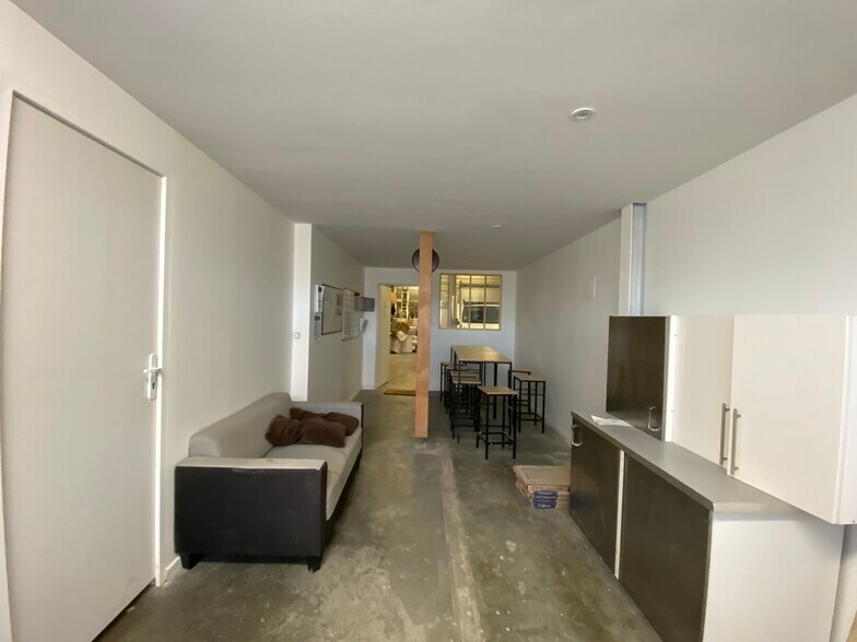 Porte sectionnelle métallique motorisée 3 x 3 m Espace commun avec cuisine et sanitaire Bureaux de 100 m² réparti entre l'étage et le RDC Portes piétonnes HSP 6 m Mezzanine de 20 m² Parking client + places privative devant le local