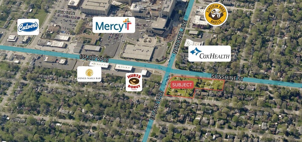 This property is located in one of the most strategic locations of Springfield at the corner of National and Sunshine. Across from Mercy Hospital — one of Springfield's major employment and visitation drivers — offering prime exposure to steady, high-quality traffic. Many neighboring businesses and organizations such as Cox Health, University of Missouri School of Medicine, TownPlace Suites, Hurts Donut Company, and many others surround the property.