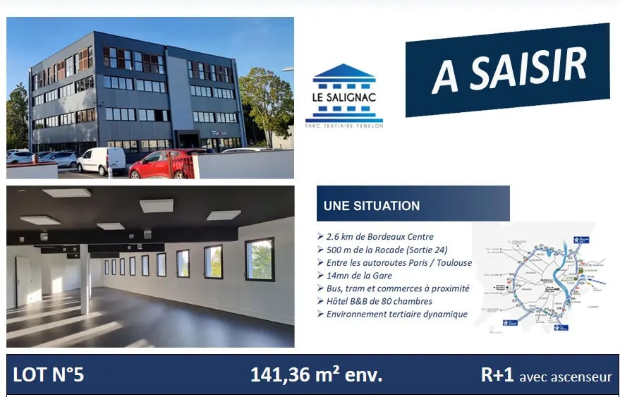 Tresses – Bordeaux Rive Droite, au sein d’un parc tertiaire récent, plateau de bureaux neufs d’environ 141 m², situé au R+1 avec ascenseur, idéal pour professions libérales, entreprises ou investisseurs. ?? Une localisation stratégique À 2,6 km de Bordeaux centre À 500 m de la rocade (sortie 24) Entre les autoroutes Paris / Toulouse 14 minutes de la gare Bus, tram et commerces à proximité Environnement tertiaire dynamique avec hôtel à proximité ??? Des bureaux neufs et modulables Plateau livré brut type promoteur Aménagement entièrement personnalisable luminosité État neuf Accompagnement possible pour le projet d’aménagement ?? Stationnement 3 places de parking privatives, dont 1 électrifiable ?? Prix Prix promotionnel HT : 245 000 € (au lieu de 286 084 € HT) Frais de notaire réduits (première vente après achèvement) ?? Atouts clés Bureaux neufs Accessibilité optimale Ascenseur Parking Forte attractivité tertiaire Opportunité rare sur le secteur ?? Dossier complet et plans sur demande - 2.6 km de Bordeaux centre - 500 m de la rocade bordelaise - Entre les autoroutes de Paris et de Toulouse - 14 mn de la Gare Saint-Jean - 2h de Paris avec la LGV - Hôtel B&B de 80 chambres - Restauration à proximité - Bus, tram et commerces à proximité